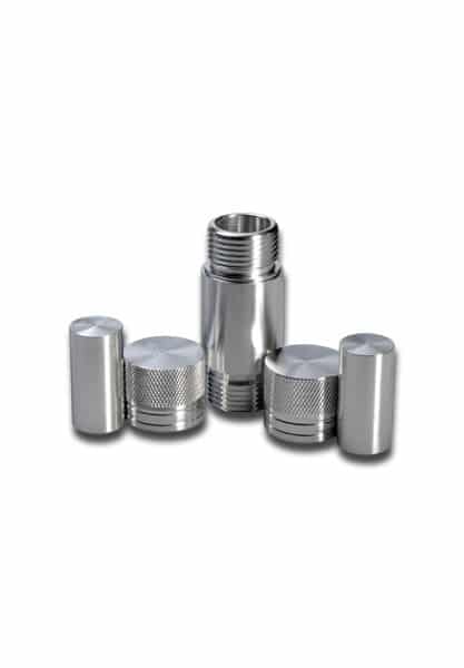 pollen press is made of robust aluminum with two bolts and a lid on each side. Remove the bolt on one side and fill in the material to be pressed. Put the bolt back in and screw on the cover. The material is pressed into a coin by repeatedly turning the two screw caps against each other.