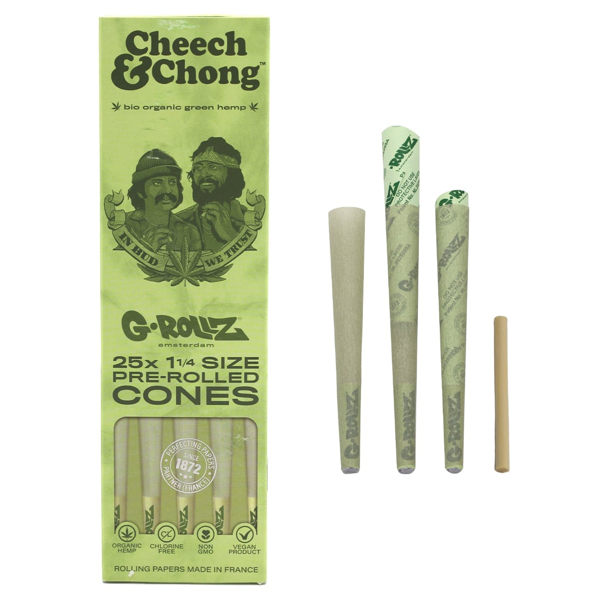 G-ROLLZ Cheech & Chong Organic Green Hemp 1¼ – 25 Pcs ConesProduct description: These G-Rollz papers are made in France using finely pressed plant fibers and acacia tree sap as an all natural gum line. All ingredients are natural for a clean rolling experience. There are 25 1¼-sized cones in each pack. These are exclusive Cheech & Chong(TM) artworks. The authenticity of each booklet can be verified individually by scanning its QR code.