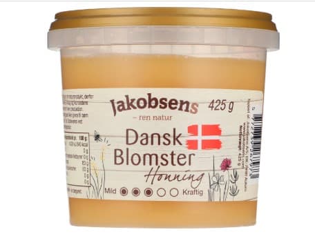 Jakobsens Danish flower honey is collected by bees all over Denmark. The honey has a characteristic sweet taste of Danish honey and is reminiscent of sun and Danish summer at its best. The honey is spreadable and has a very nice light and golden color. The honey is suitable as a spread and can also be used in baked goods and desserts.