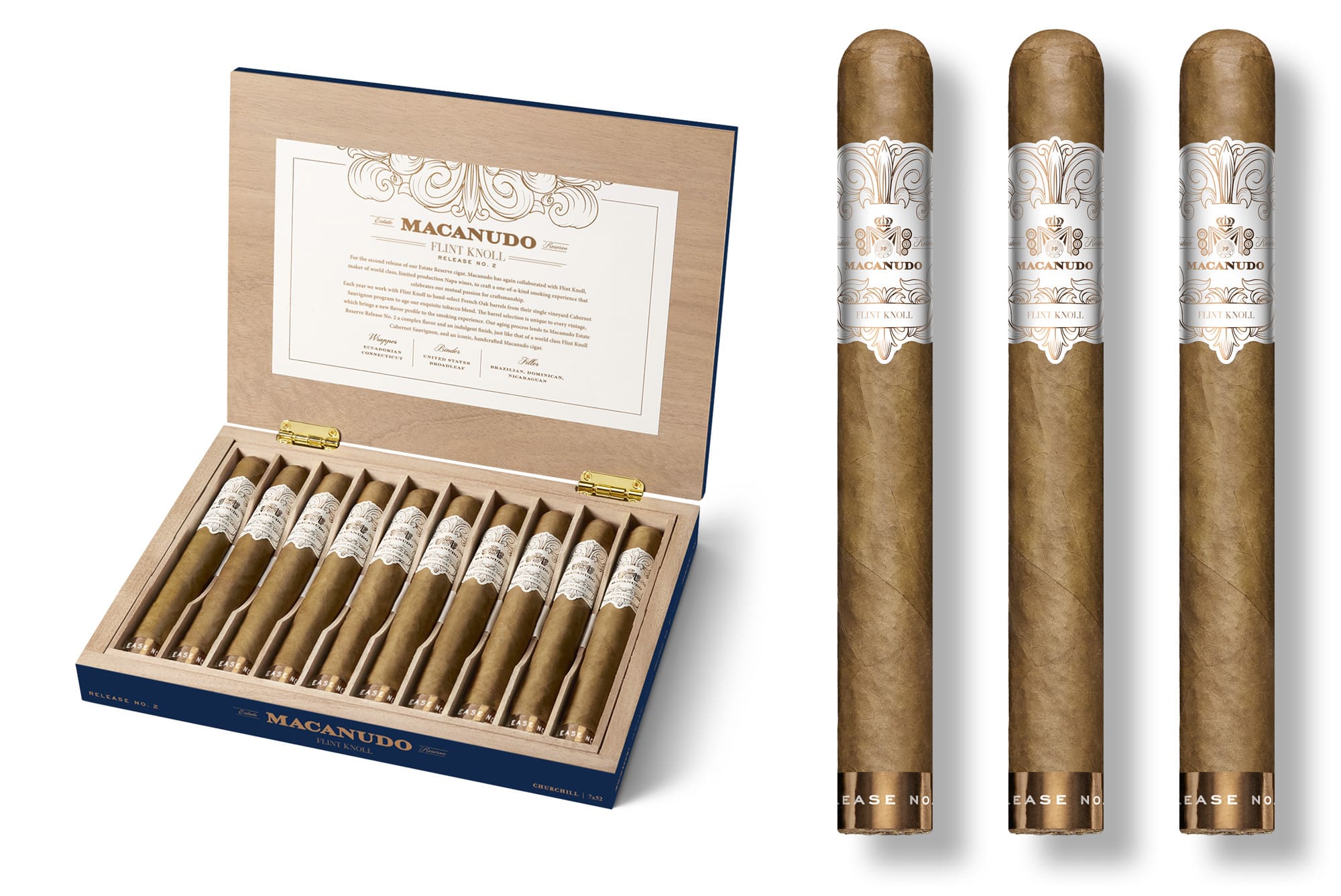 Continuing our partnership with Flint Knoll Winery, Macanudo Estate Reserve Release No. 2 features tobacco aged in the world’s finest French oak barrels used to produce Flint Knoll’s prestigious Napa Valley Cabernet Sauvignon.