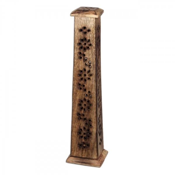 Mango wood incense holder 310mmProduct description:You can either put four incense sticks in this mango wood tower or let an incense cone burn inside the tower.✔️med hand carvings✔️lavet made from real mango wood✔️til incense sticks and incense conesSafety note: Never leave lit incense sticks/cones unattended!