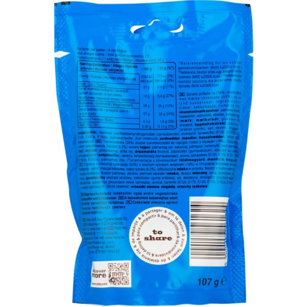 Ingredients: sugar, cocoa mass, rice flour (9.2%), SKIMMED MILK POWDER, palm kernel fat, cocoa butter, palm fat, starch, whey permeate (MILK), MILK FAT, glucose syrup, shea fat, BUILDING MILK EXTRACT, stabilizer (gum arabic), salt, dextrin, emulsifier (SOY lecithin), dextrose, glazing agent (carnauba wax), flavoring, colorants (E120, E170, E133, E100, E160a, E160e), palm kernel oil. (May contain: EARTHNUTS, ALMONDS, HAZELNUTS). At least 25% cocoa solids.