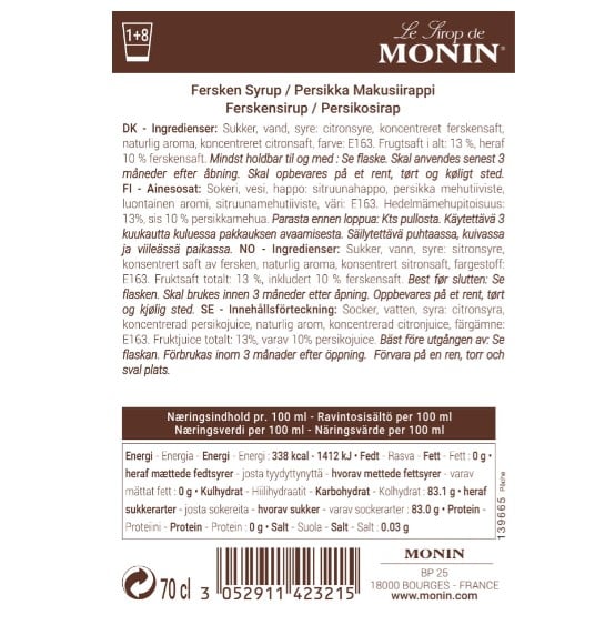 Monin Syrup Peach presents a brilliant light golden orange color along with a very persistent exceptionally rich taste and fragrant peach aroma.