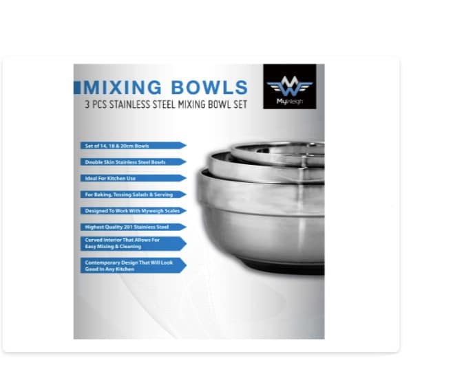 A stylish and durable set of three mirror polished stainless steel bowls. Heavy-duty construction and elegant finish make them both functional and decorative. Perfect for precision weighing, cooking, baking and serving. The bowls are stackable and dishwasher safe – and are particularly suitable as accessories for My Weigh digital scales.