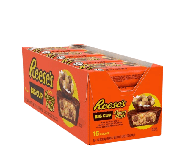 Reese’s Big Cup with Reese’s Puffs King Size 16 x 68g is an irresistible combination of creamy peanut butter, crunchy Reese’s Puffs cereal and rich milk chocolate. Each 68g Big Cup offers a generous serving of classic Reese’s flavor with an added crunchy twist, making them ideal for both personal enjoyment and sharing.