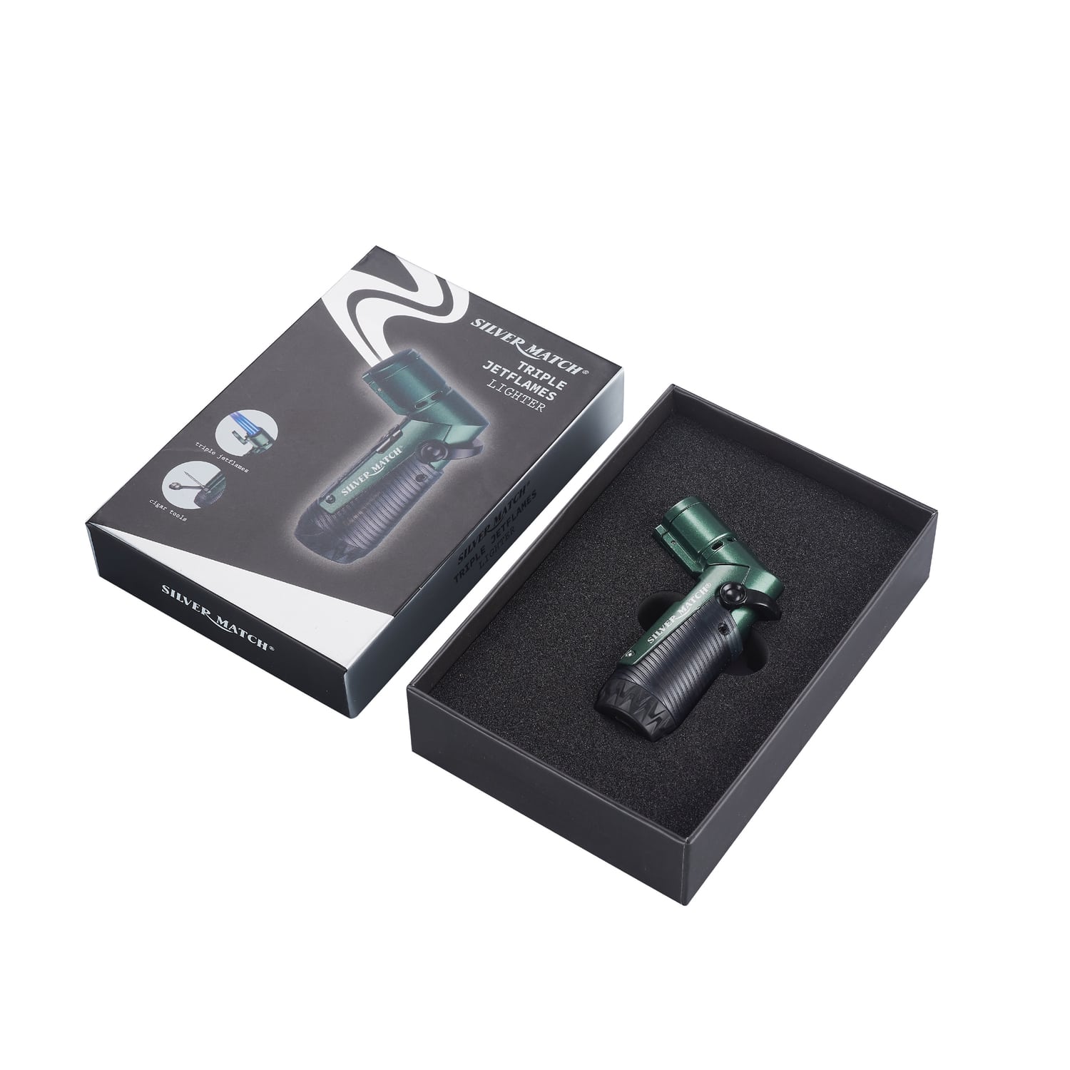 The Silver Match Triple Jetflames Lighter is a powerful jetflame lighter with three concentrated blue flames, designed for fast and stable ignition. It is often used for cigars, hookahs or outdoor activities where a regular flame may have difficulty igniting.