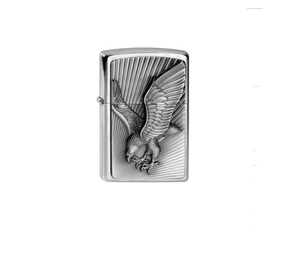 Original Zippo® wind lighter in brushed chrome with distinctive 3D eagle emblem. Refillable, wind-safe design made in the USA. Perfect gift idea for him. Without fuel.