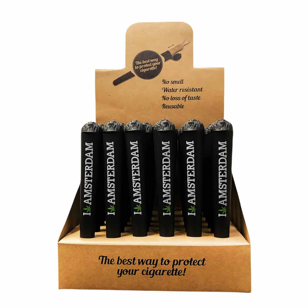 Joint Holders Amsterdam Black er den perfekte måde for urteelskere at bære og opbevare cigaretter. Hold duften (lugtsikker) inde med disse tætte forseglingsrør. Brugerdefineret printbart område med forskellige prints og designs. Den er mat behandlet og yderst attraktiv.