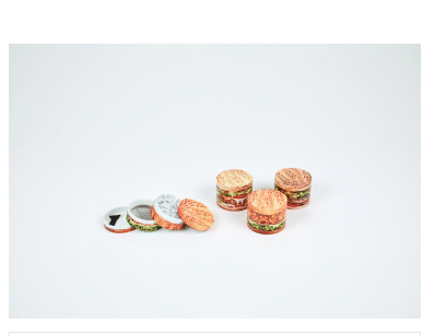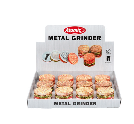 Atomic 3D Hamburger Metal Grinder 4‑parts ø50 mm kombinerer legende design med solid funktionalitet. Grinderen er formet som en saftig burger med realistisk 3D‑look, og består af fire dele: skarpe tænder til opmaling, si til pollen, opsamlingskammer og magnetisk låg. Fremstillet i robust metal, leverer den jævn og effektiv opmaling af urter, samtidig med at den skiller sig ud med sit sjove og kreative udtryk. Med en diameter på 50 mm er den kompakt nok til at tage med på farten, men rummelig nok til daglig brug.