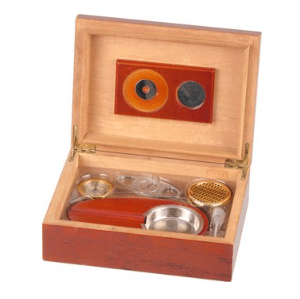 Dette sæt garanterer den perfekte adgang til fornøjelsesrygningens verden. Den enkle humidor med en elegant palisanderfiner er fyldt med næsten alt hvad du behøver for at nyde cigarer. Kutteren giver det nødvendige snit og askebægeret er ikke kun til at fange aske og cigarrester, den har også en praktisk hylde.