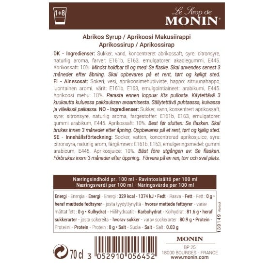 Monin Syrup Apricot kan nydes ved at blive blandet med andre frugt smag for at lave punches, smoothies, iste og sodavand.