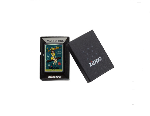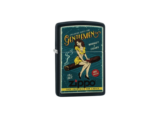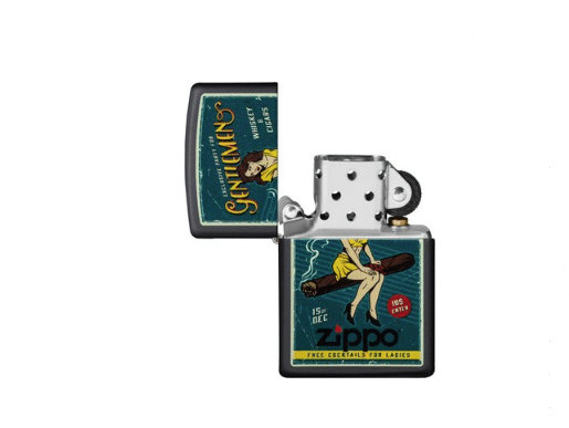 Stilfuld og vind‑tæt lighter fra Zippo med “Cigar Girl” motiv og mat sort finish – genopfyldelig, livslang garanti, perfekt til samling eller gave.