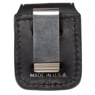Lighter Pouch w/Clip er en sort læderpung med metalclips på bagsiden, der gør det muligt for dig at bære din Zippo lighter i bæltet, i bukselinningen eller at placere den på solskærmen i bilen. Knappen sikrer at lighteren forbliver beskyttet i pungen og detaljer som Zippo’s logo og en sølvstribe i det sorte læder, fuldender læderpungen der er et must for Zippo ejeren