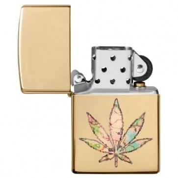 Dette minimalistiske, men dog elegante design har et marihuana-blad på en High Polish Brass lighter. Detaljerne i den slående fusionsproces skaber et iriserende blik inden i pot bladet.