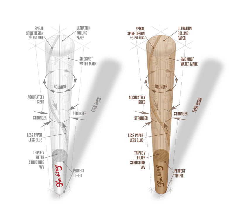 - Brune Kingsize-cones x3: Mere miljømæssigt bæredygtige. Disse XL-cones bruger Smoking® ubleget ultrafint papir, som er rygepapiret fra Smoking®’s Brown-serie. Den eneste forskel er, at du med rullepapir også har brug for filtre, i modsætning til vores cones. Disse specifikke cones har et spiraldesign og bruger Smoking® Brown-papir til at give en langsom forbrænding, mens du nyder din King Size-røg.