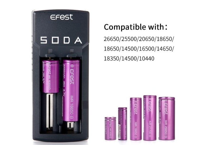 Den multifunktionella batteriladdaren Efest SODA kan ladda 2 batterier samtidigt, varje fack övervakar och laddar batterierna oberoende av varandra. Den identifierar automatiskt uppladdningsbara Li-ion-, Ni-MH- och Ni-Cd-batterier.