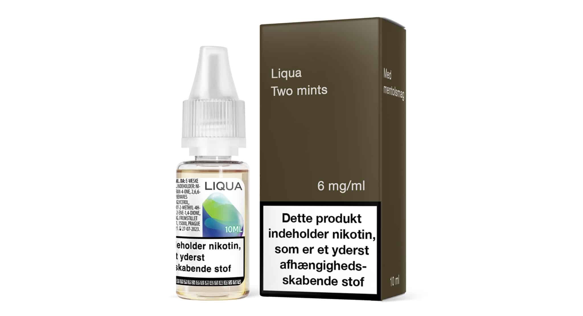 Liqua Two Mints 6mg 10mlProduktbeskrivning: Stimulera dina sinnen med denna uppfriskande blandning av söta och örtiga minttoner. Vätskanär klar att använda, häll den på e-cigaretten och njut av smaken .