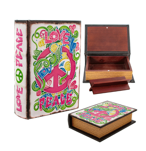 En elegant och diskret förvaringslåda i trä – formad som en bok med ett färgglatt “Love & Peace”-motiv. Perfekt för dig som vill förvara mindre föremål på ett smart och dolt sätt.