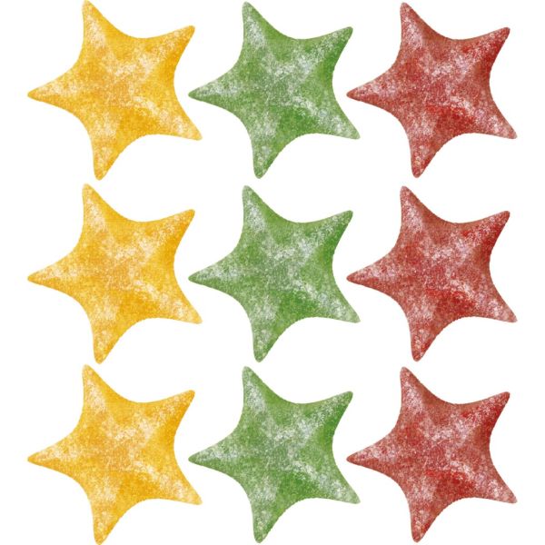 Ingredienser: socker, glukossirap, stärkelse, syror (citronsyra, vinsyra), aromer, färgämnen (E141, E160e, E160a).