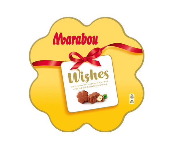 Marabou Wishes är vackra praliner med krämig hasselnötsfyllning och ljus mjölkchoklad som kan få vem som helst att känna sig glad och uppskattad,