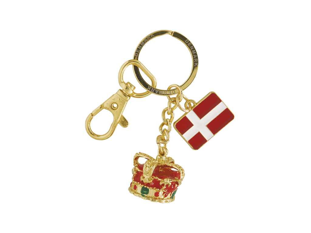 Ta med dig en elegant bit av Danmark i din vardag. Denna nyckelring med krona och flagga i guld är en vacker souvenir som symboliserar både dansk kunglig historia och nationell stolthet.