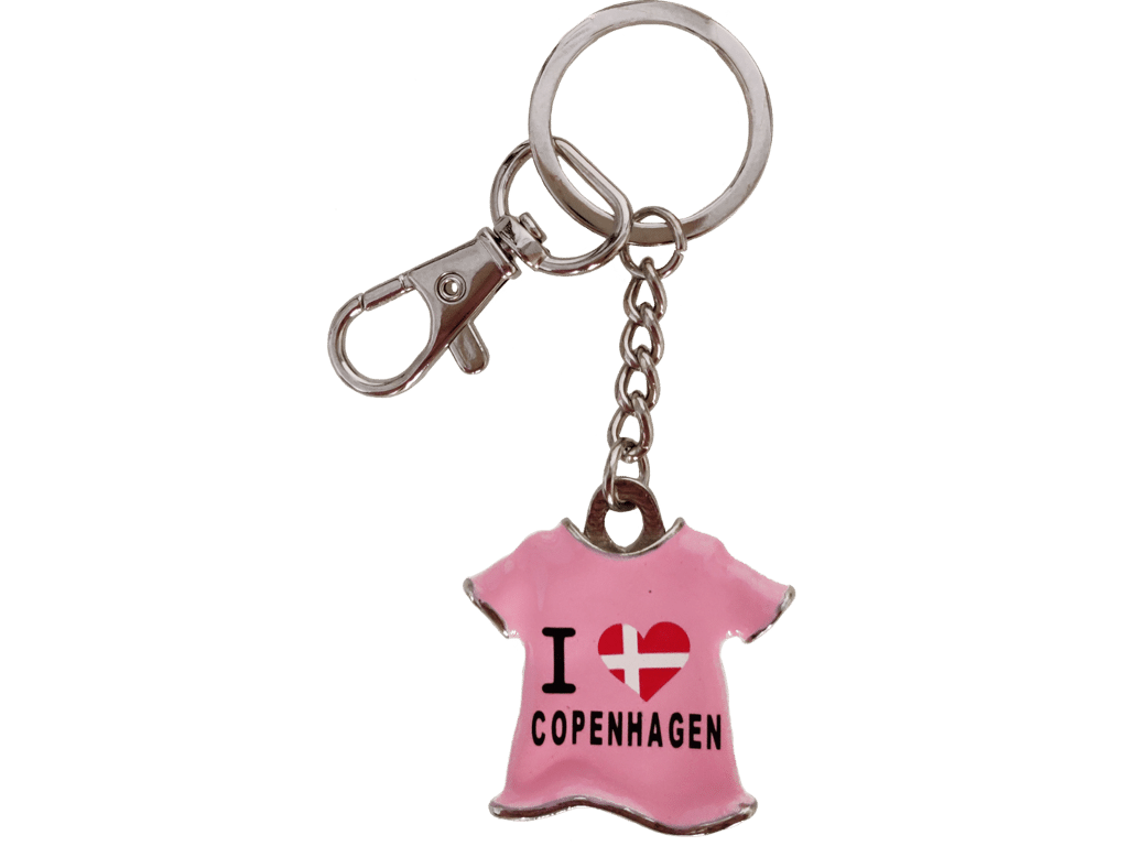 Ta med dig en liten bit av Köpenhamn! Denna T-shirt-formade nyckelring i en vacker rosa design med texten “I Love Copenhagen” är den perfekta souveniren eller presentidén.
