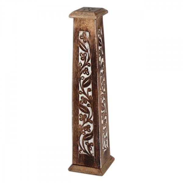 Rökelsehållare i mangoträ 31 cmProduktbeskrivning: Du kan antingen lägga fyra rökelsepinnar i detta torn i mangoträ eller låta en rökelsekotte brinna inuti tornet.