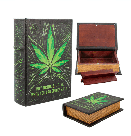 En snygg och diskret förvaringslåda i trä formad som en bok med ett humoristiskt och tankeväckande motiv: “Why Drink & Drive when you can smoke and fly.” Denna design kombinerar trivial estetik med en dold funktion – perfekt för dig som vill förvara små värdesaker på ett smart sätt.