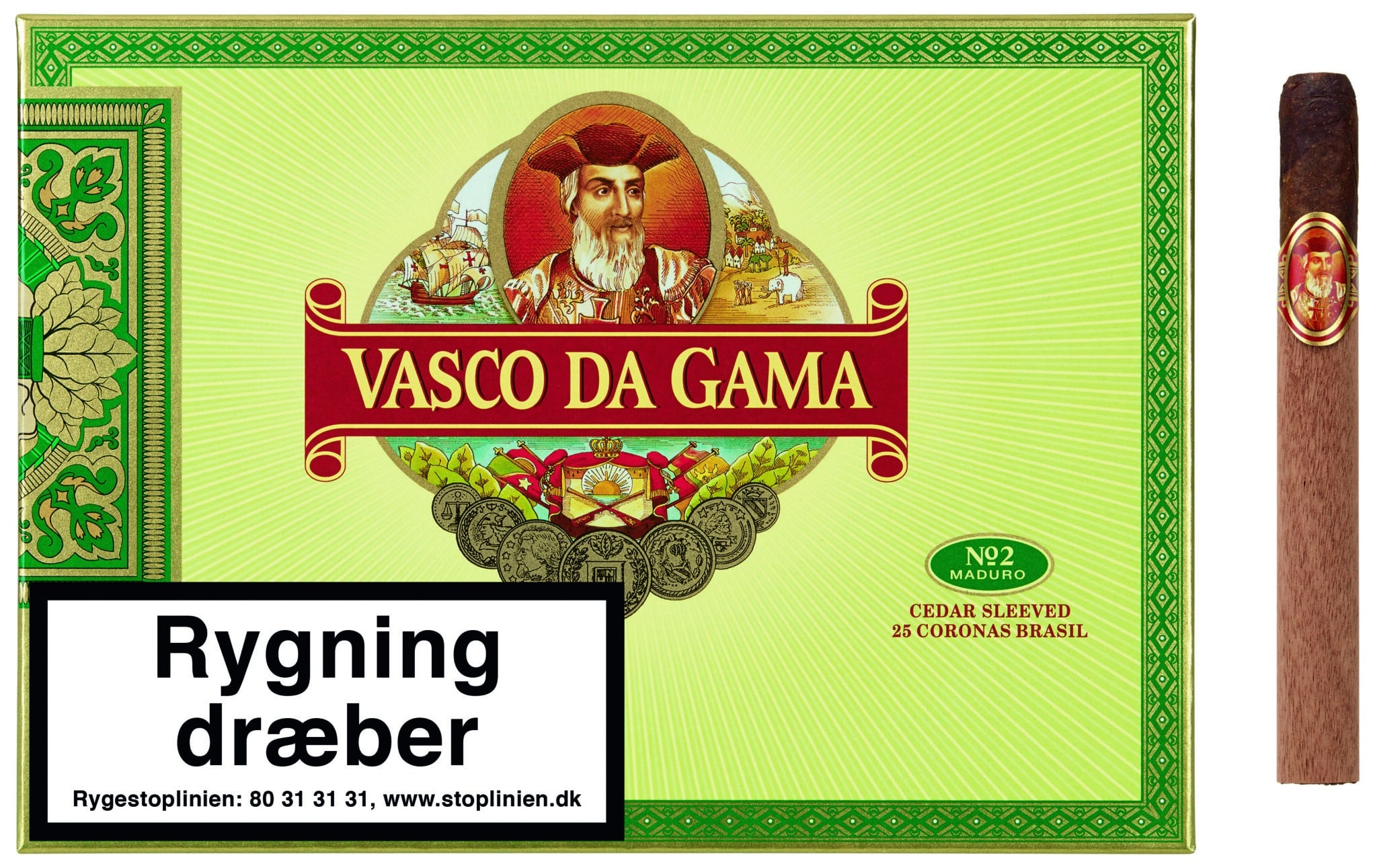 Vasco da Gama Corona Brasil No. 2 Maduro är den något kryddigare motsvarigheten till den populära Vasco da Gama Corona Sumatra No. 2 Claro. Som maskintillverkad short filler uppfyller den alla kriterier för en cigarr som inte rullas för hand. Den är väl bearbetad, har en medelhög styrka och en mild aromatisk smak och ger en röktid på 30-40 minuter. Var och en av dem är insvept i ett cederblad för att skydda aromen.